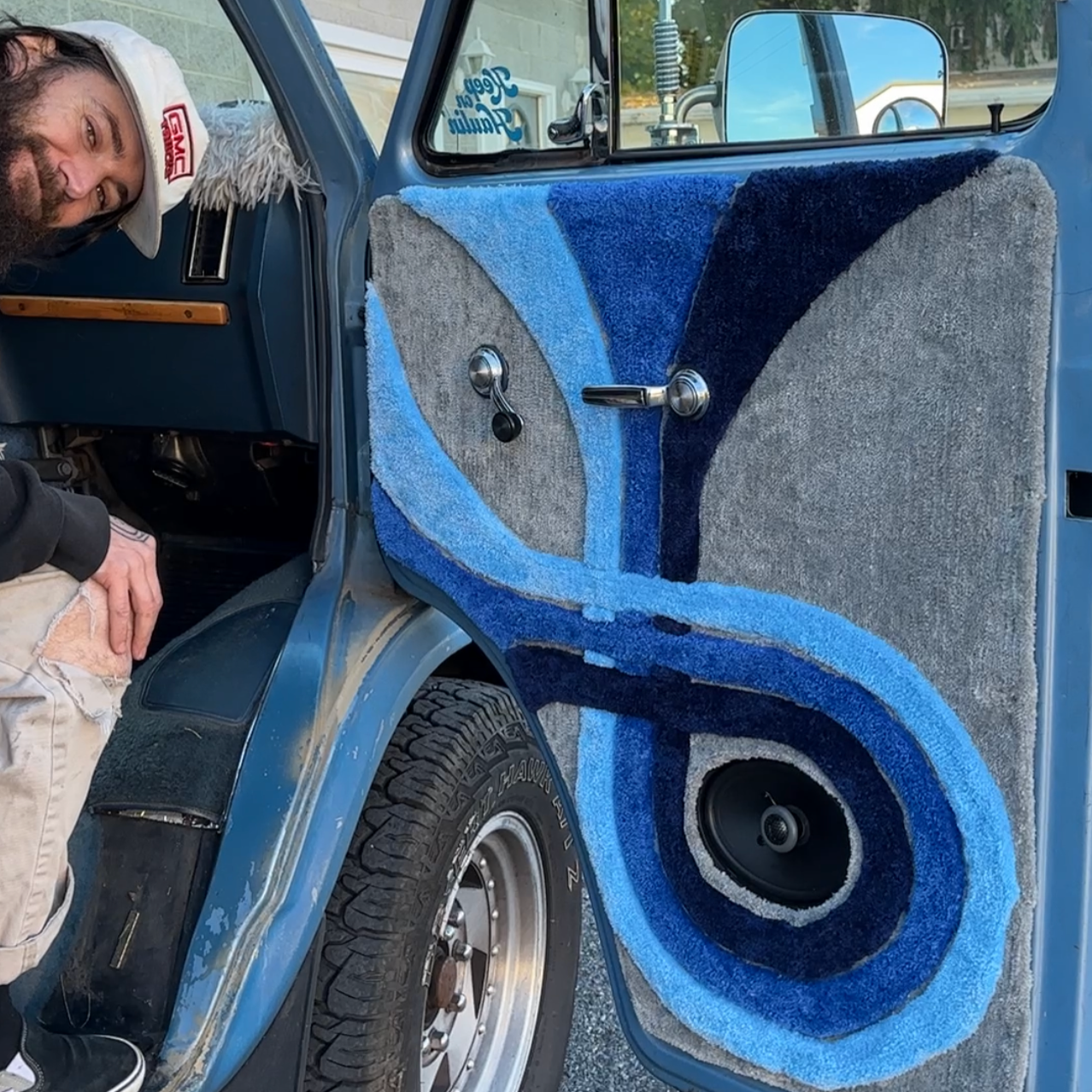 My favorite tufted piece so far is definitely the custom door cards that I made for Heidi in 2022. I designed the loops to go around her speakers and the different shades of blue look great with her interior. Check out the making of video on instagram and tiktok!