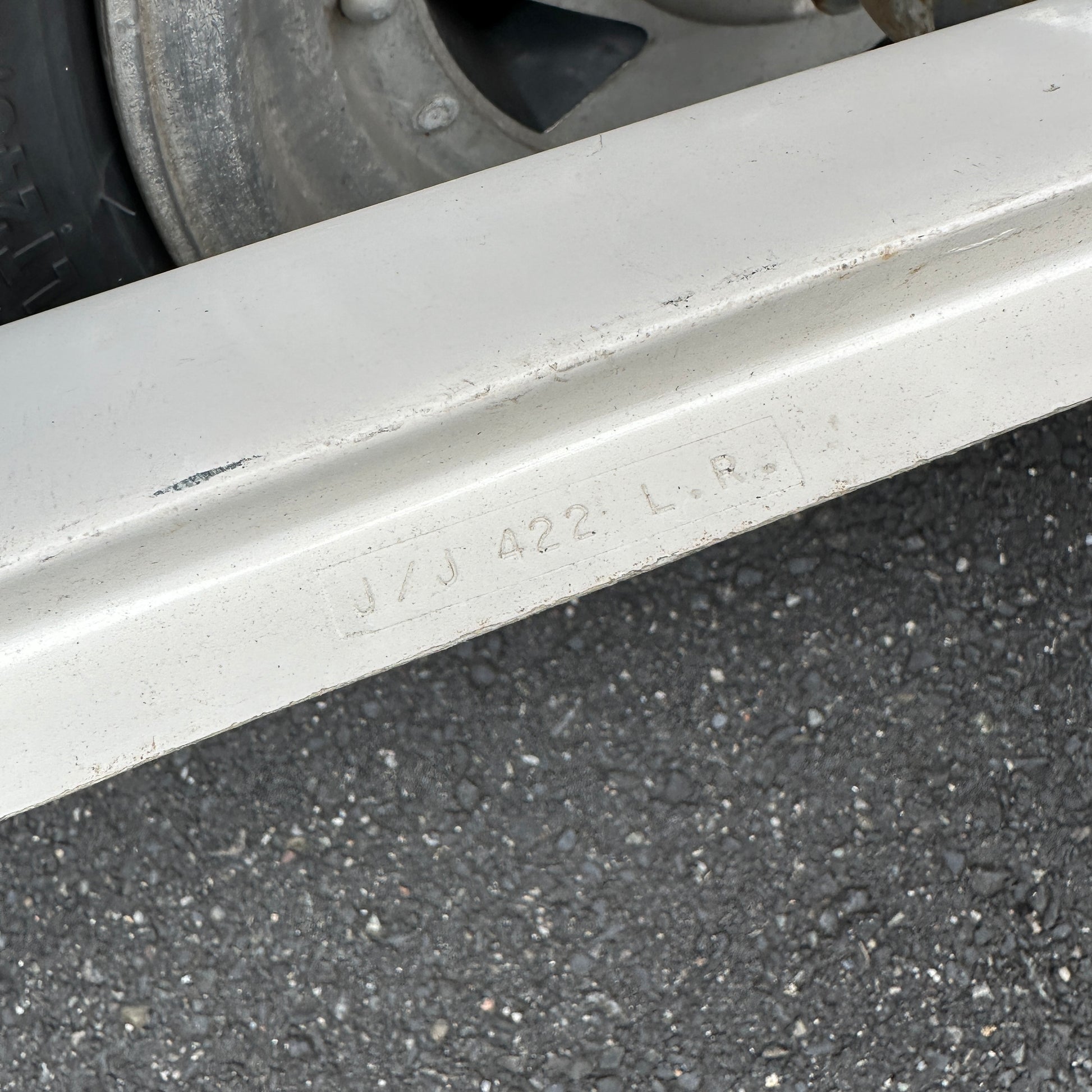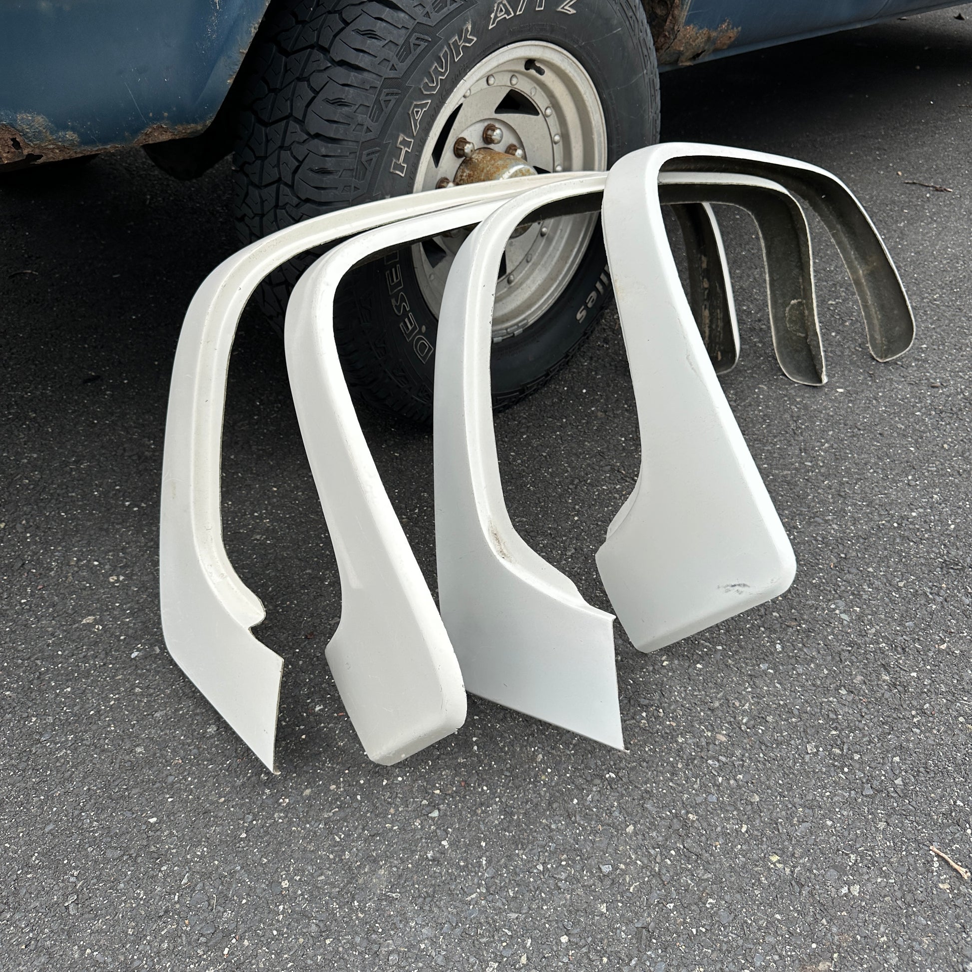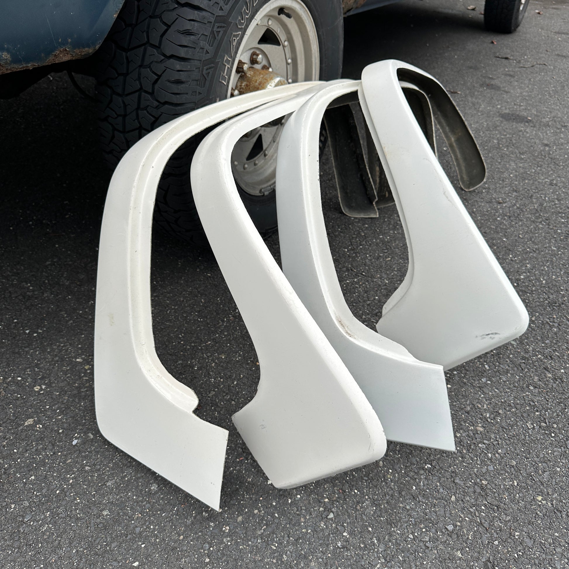 “New” from a distributors lot that was moved to barn storage for the past ~30 years. These original J&J Mudder style fender flares show minor wear and tear from storage, but has never been mounted or seen time on the road. It does show minor discoloration, chips, scratches, etc. Please see all photos for condition.