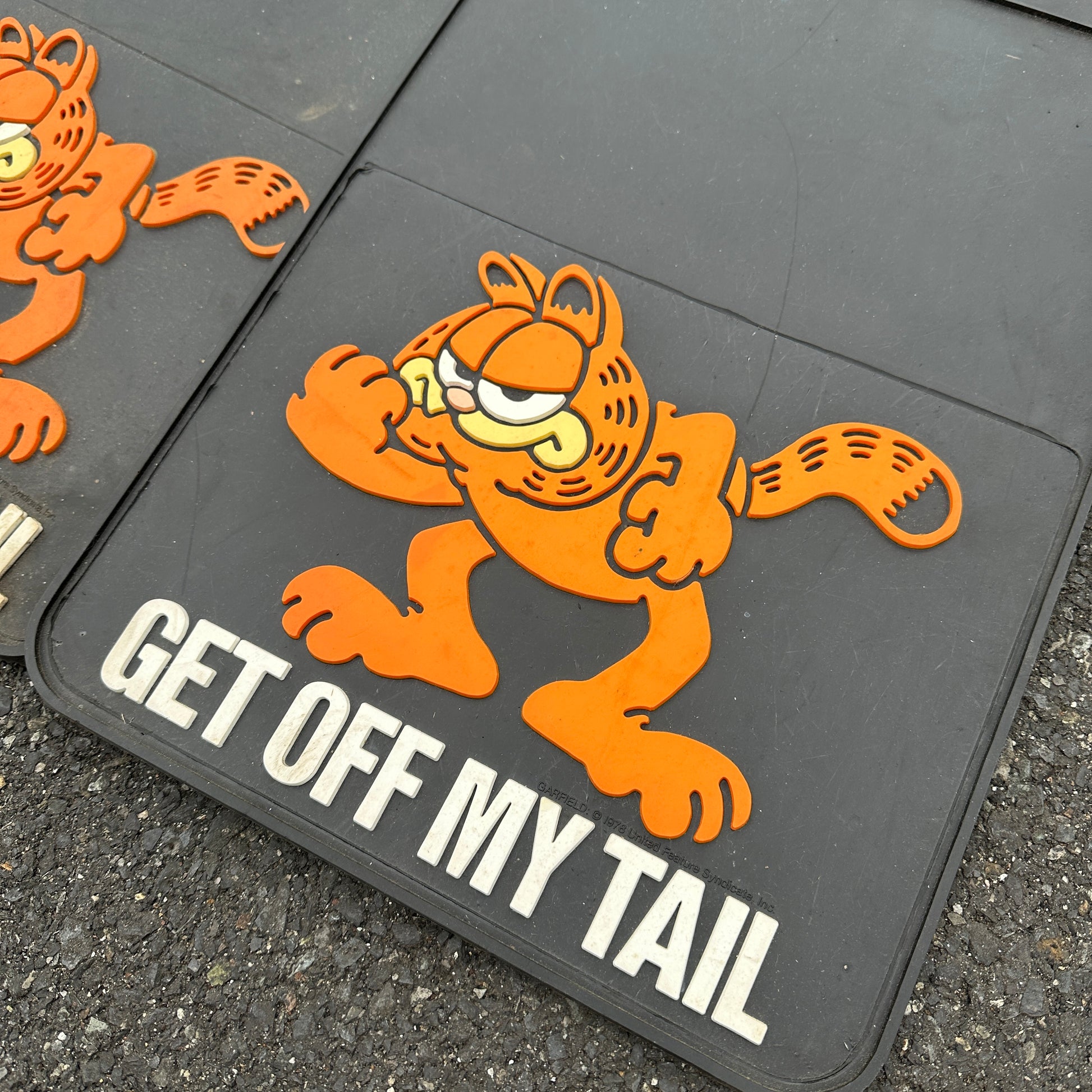 Vintage Get Off My Tail mud flaps by Plasticolor. Classic molded-in design.