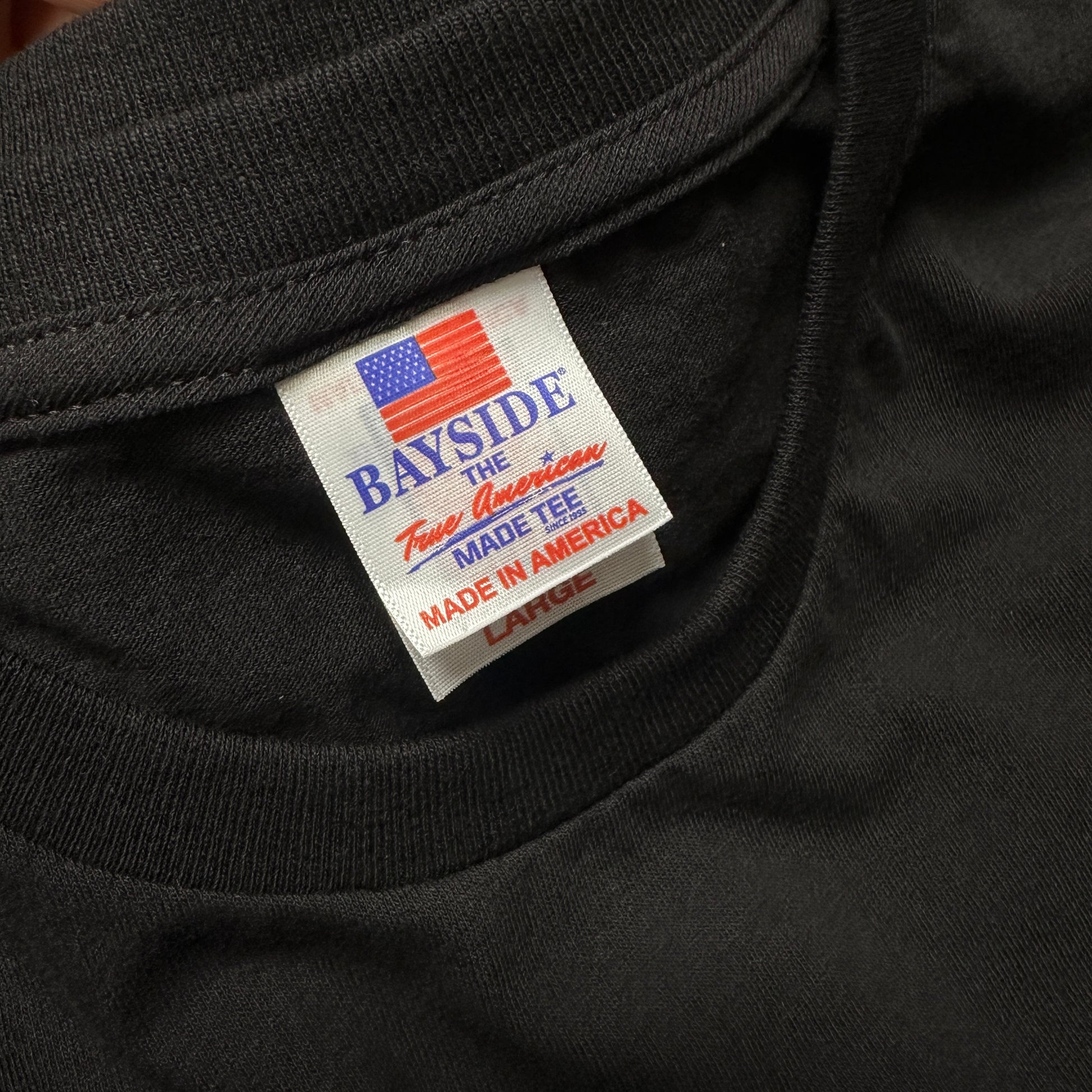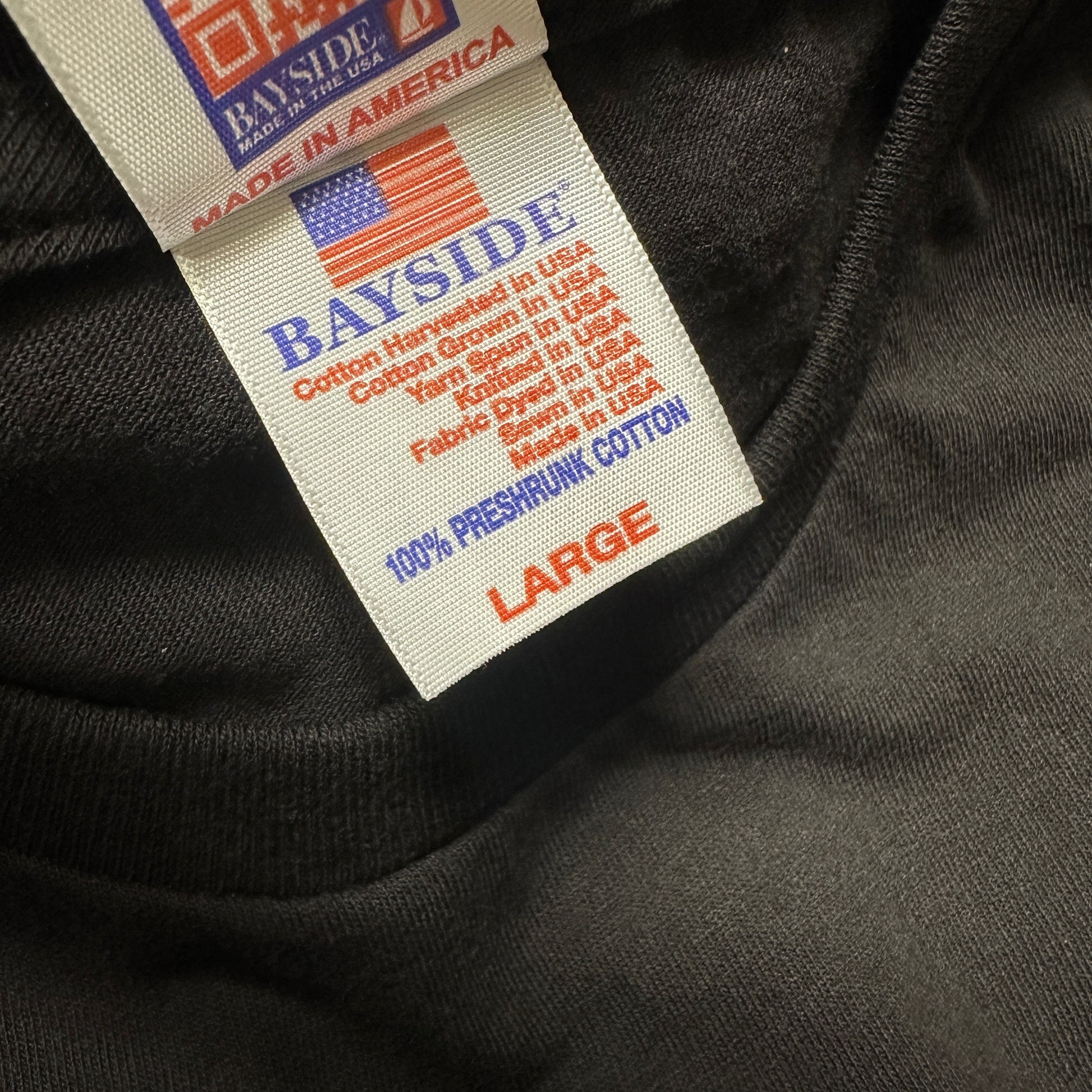 Shirts are screen printed on 100% cotton USA Made Bayside Mid-Weight pocket tees.