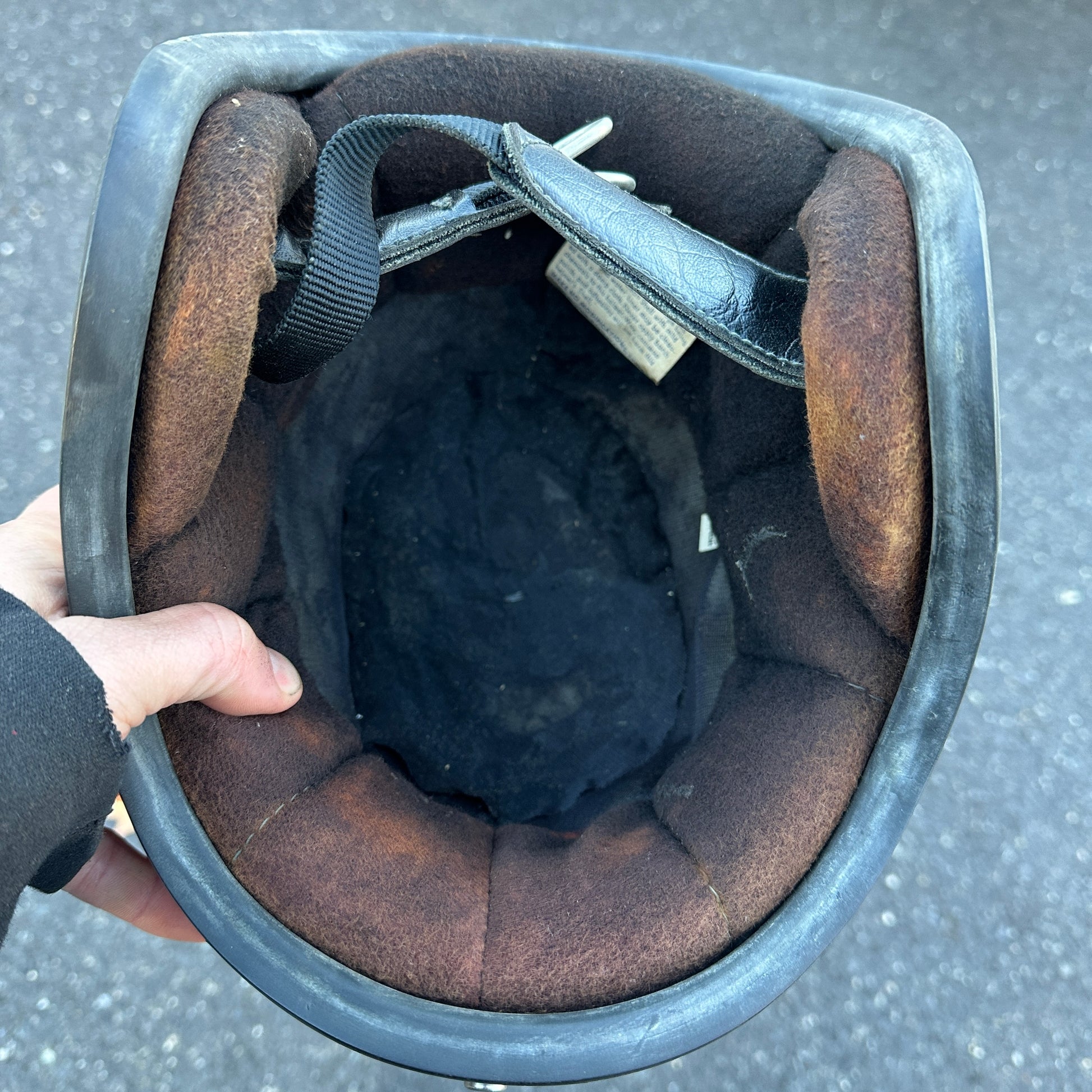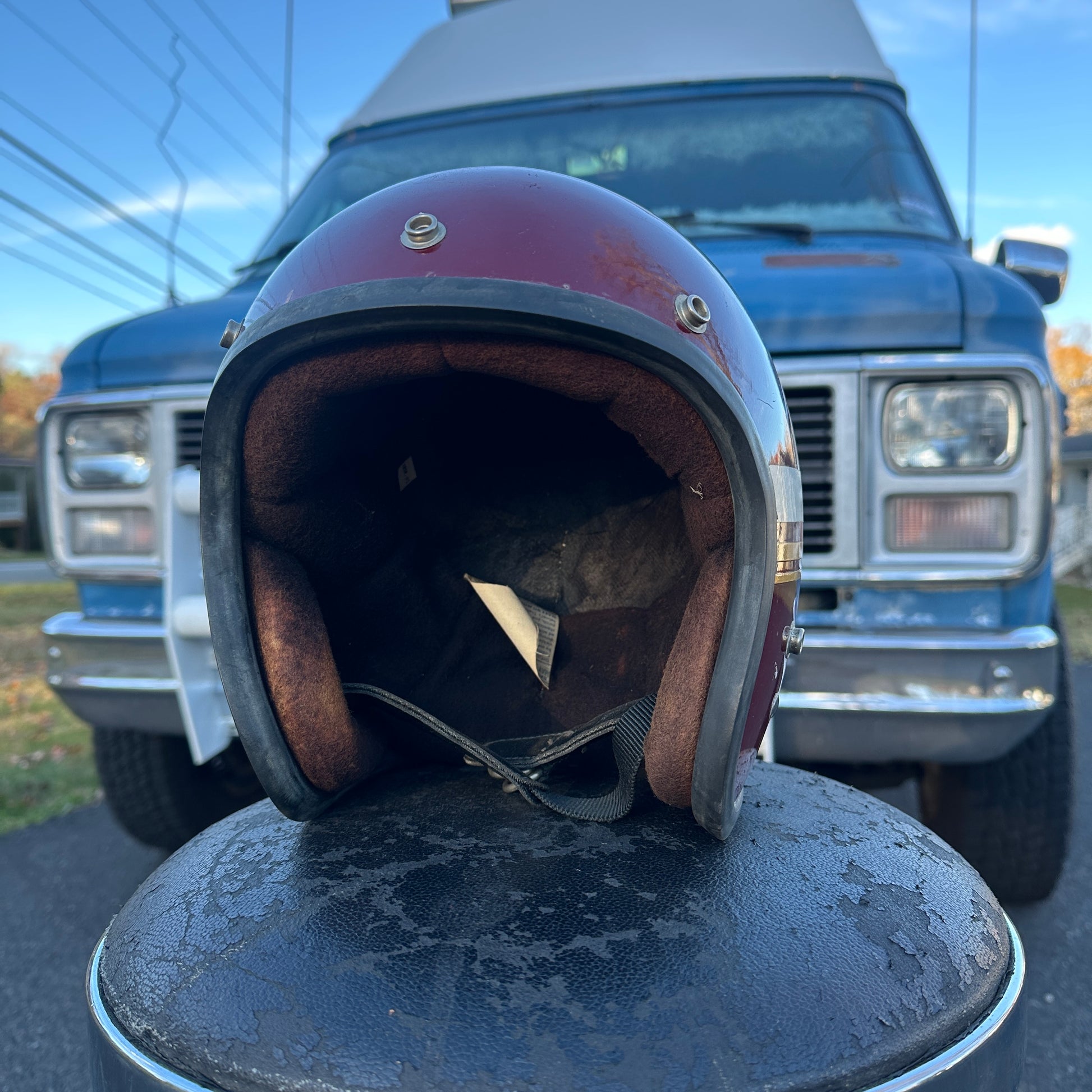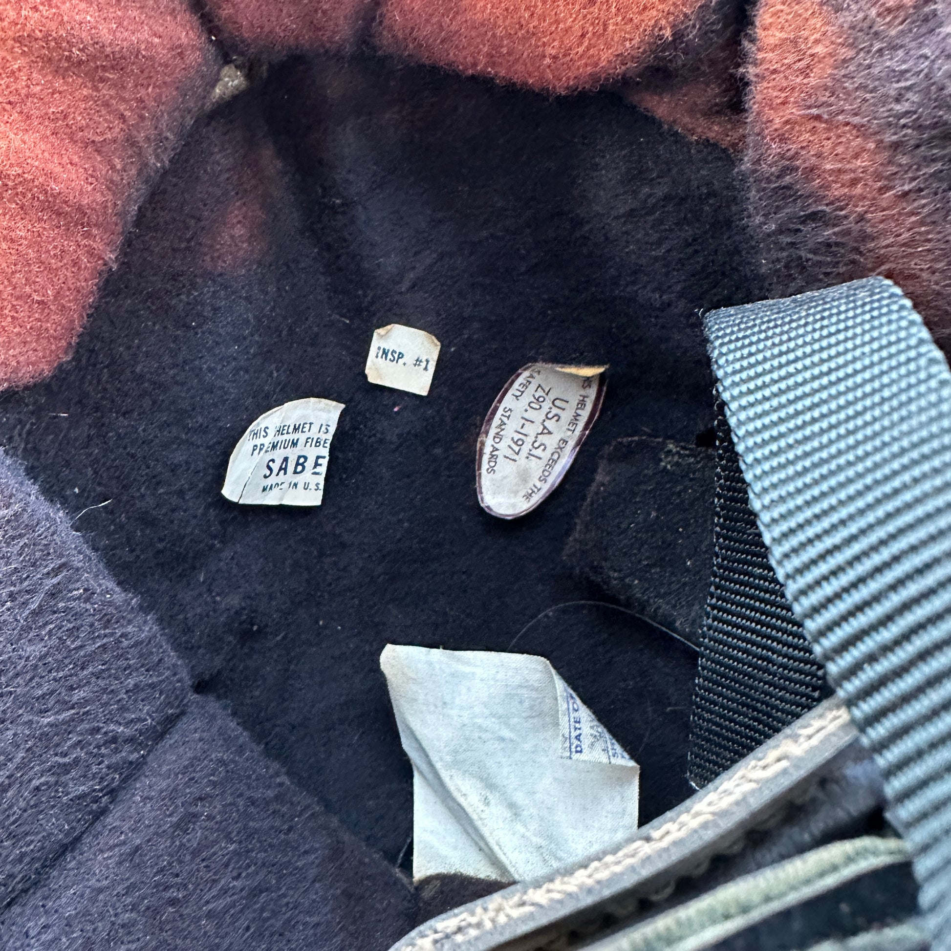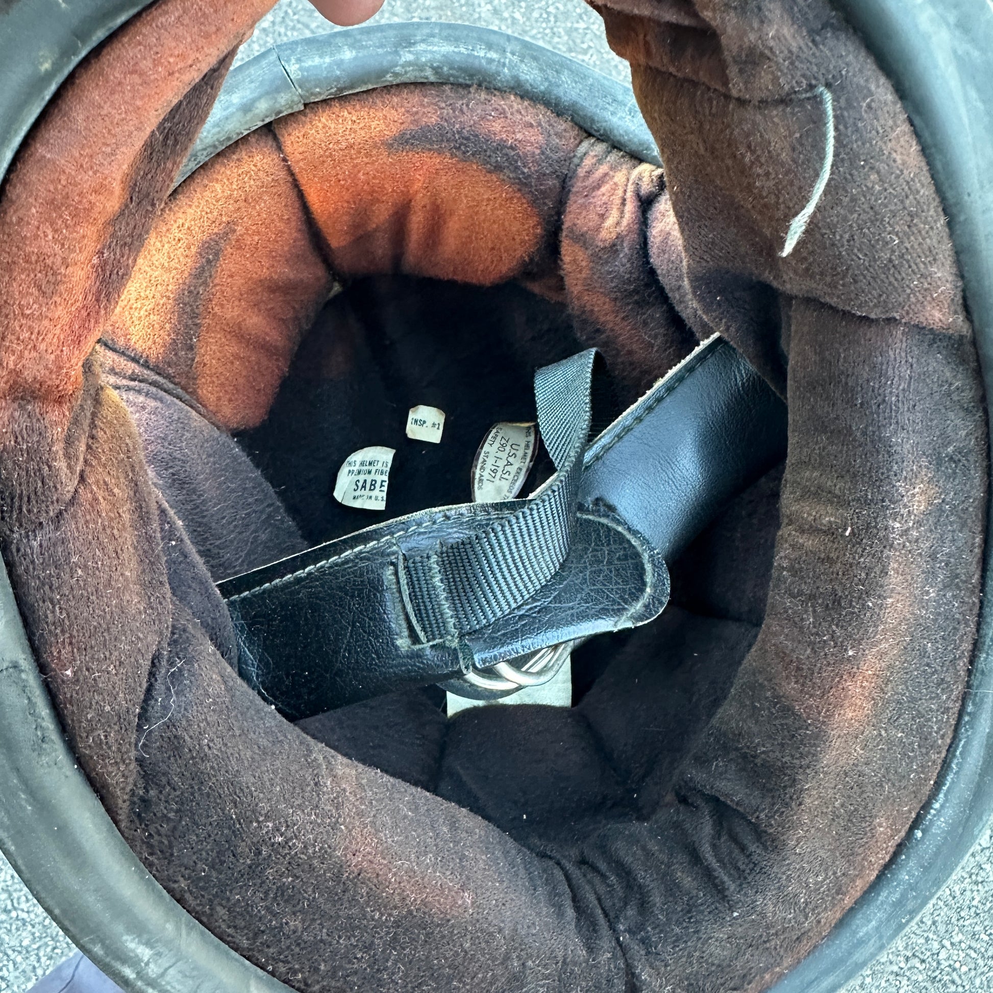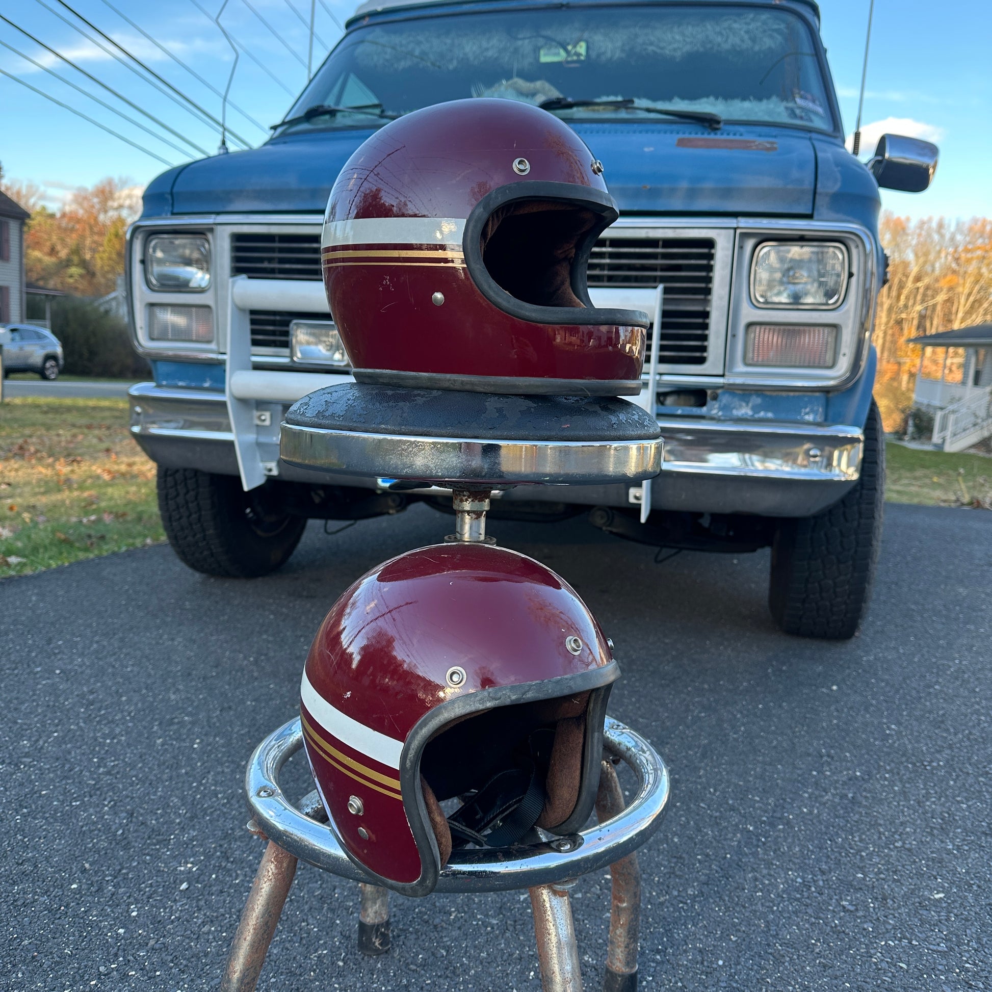 Matching graphics, one full face one 3/4. Both Saber 1978 made in USA. I think liner looks rough in photos but I'd wear either one of these as-is.