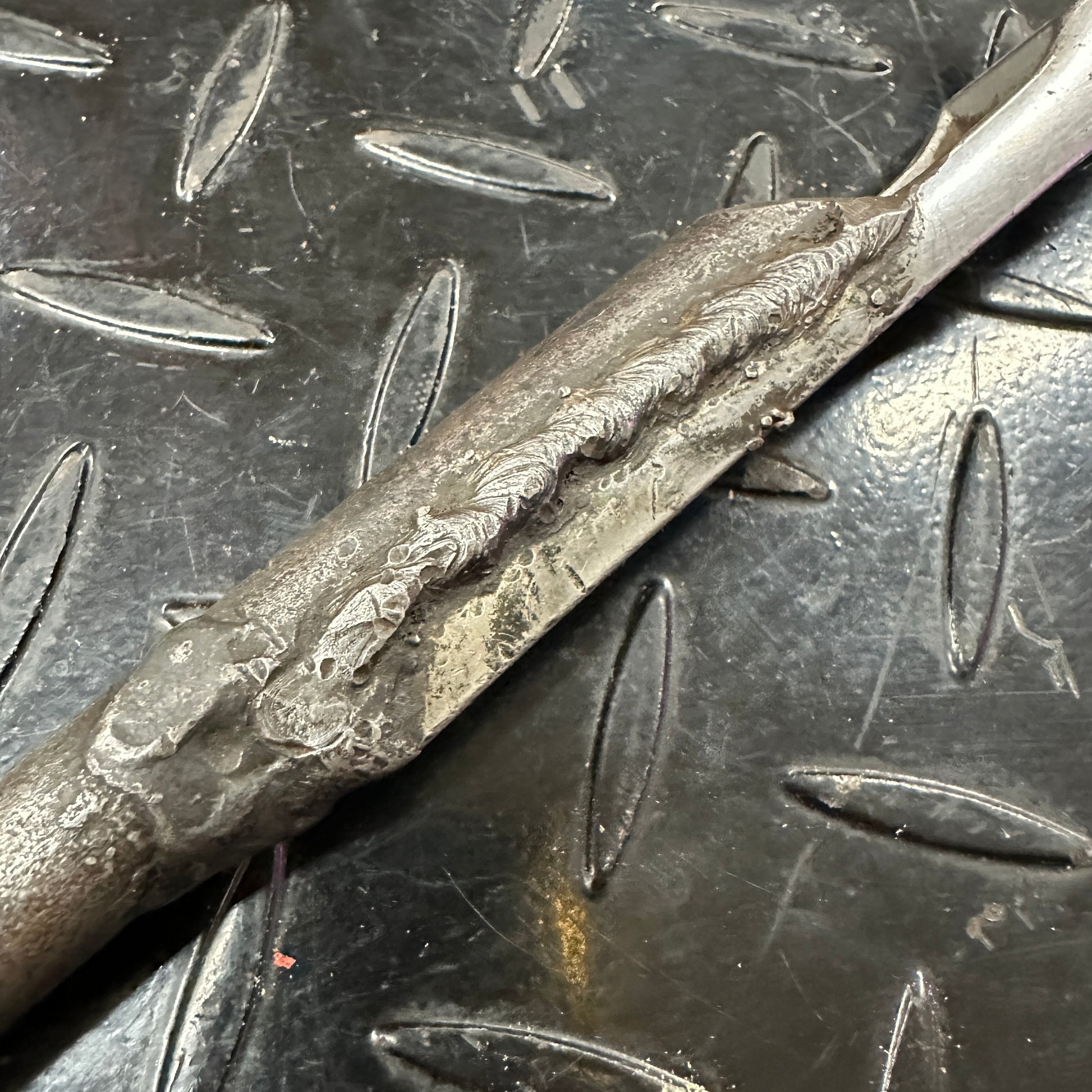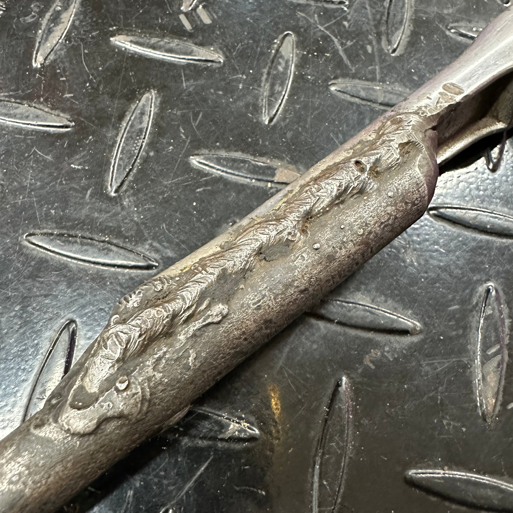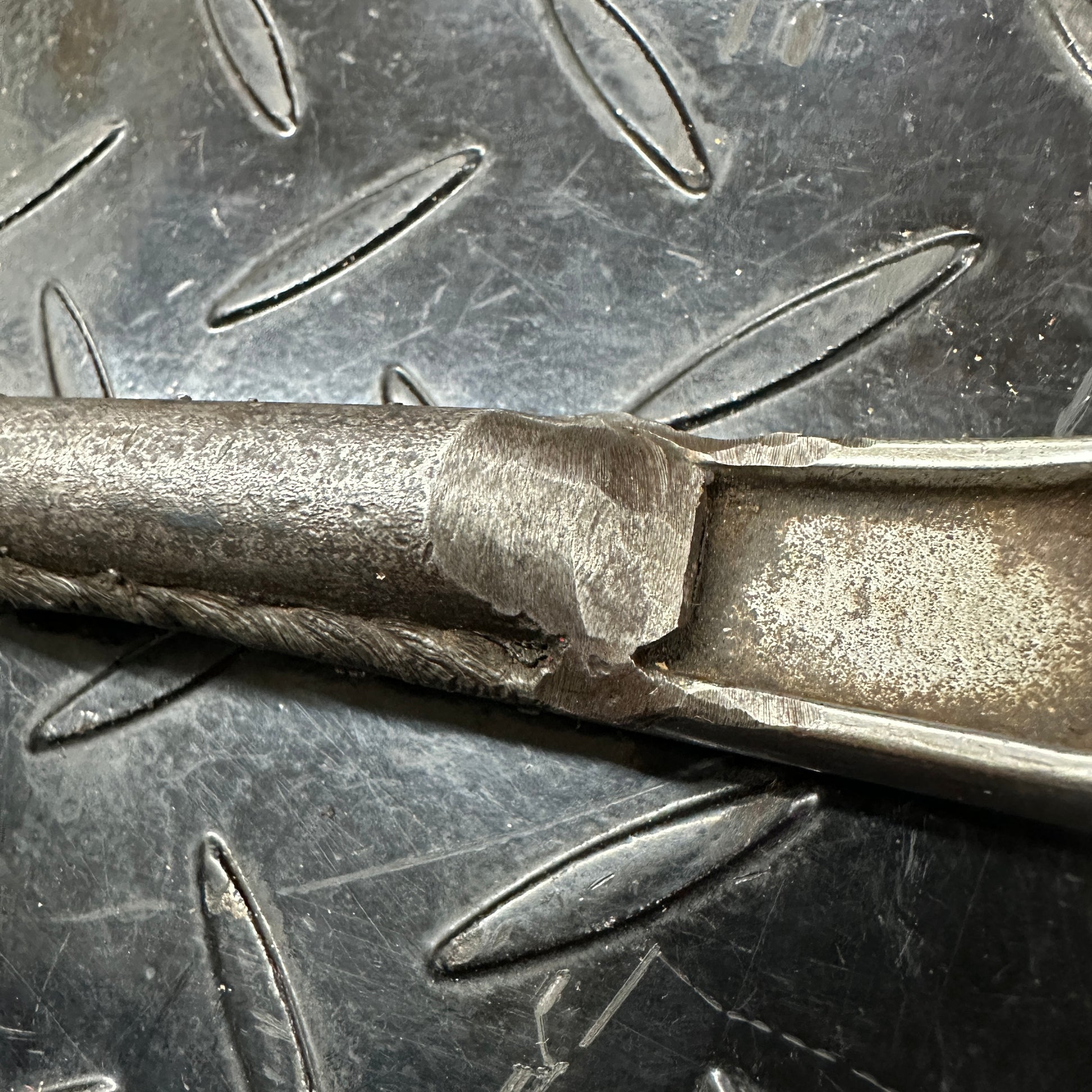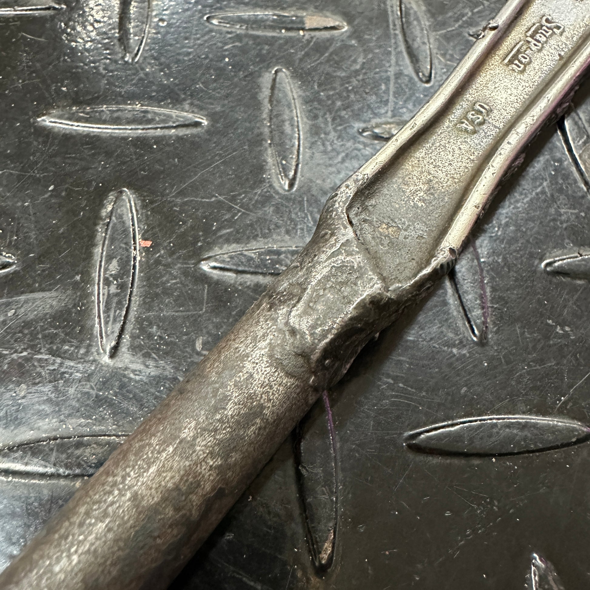 This thing is wild, a mechanics homemade tool. Unknown date Snap On 3/8" Drive ratchet with a prybar welded to it for a total length of about 18". Wrench, break, poke, pry. Made in the USA. In good working condition, but not a museum piece. An honest tradesmans tool, wiped down but could use a deep clean. Or put it right back to work and make it greasier!