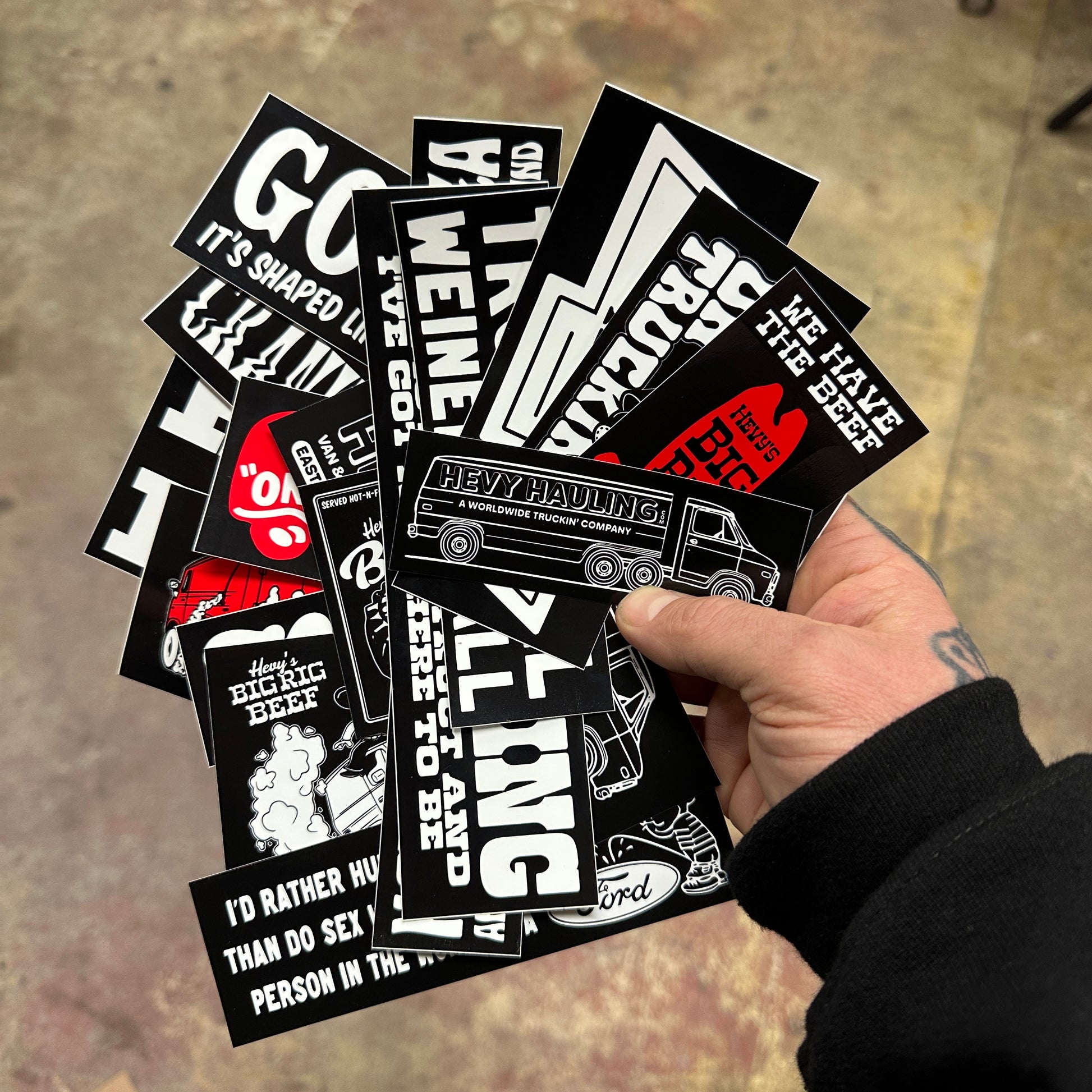 Hevy Stickers any way ya want em. All screenprinted on hevy duty outdoor vinyl, these are made to last. We've seen em go years on a daily driver without fading.